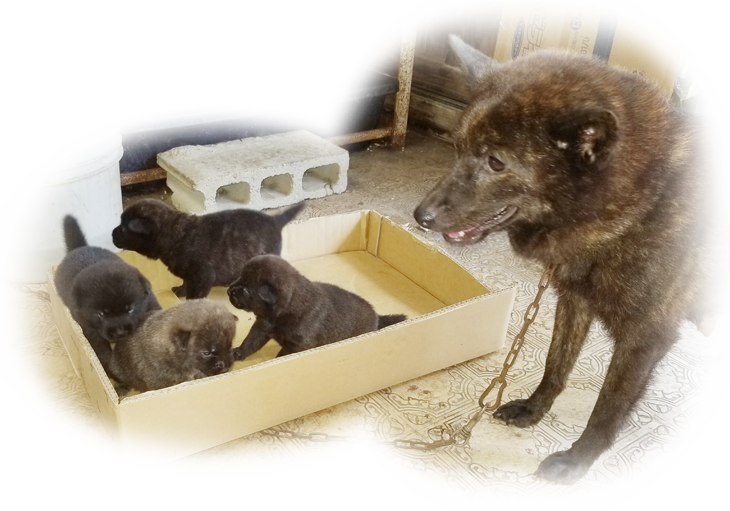 2025年7月4日に「紀ノ国赫ノ中将姫(呼び名=あか)」が仔犬を出産しました。中虎毛♂1頭、赤虎毛♀1頭、中虎毛♀1頭、黒虎毛♀1頭の計4頭です。毛色は成長と共に変化しますので、現在の所見からの予想です。血統登録は甲斐犬愛護会となります。紀ノ国赫ノ中将姫の母の母「播磨の琴姫」は愛護会136回展成犬牝の部2席、母の父「千太狼」は愛護会第145回展未成犬牡の部3席、母の父の父「皇」は愛護会第141回展成犬牡の部2席、父の母の母「舞香」は愛護会第147回展壮犬牝の部1席、父の母の父「鉄海」は愛護会第140回展総合優良犬優勝、交配相手は「紀ノ国神武」で、その父「黒龍神」は愛護会第153回展総合優良犬優勝、父の父「彩の神」は愛護会第137回展総合優良犬優勝、父の母の母「甲斐の虎姫」は愛護会第140回展総合優良犬準優勝、父の母の父「国秀宝」は愛護会第146回展総合優良犬準優勝、父の父の母「彩華姫」は愛護会第127回展未成犬牝の部2席、父の父の父「南陽の力皇」は愛護会第130回展総合優良犬優勝他、両親とも近親の賞歴等が多数あり、甲斐犬本来の優れた資質を持つ優良な血統です。今回は紀ノ国神武の優良な形質を伝えるため、意図的にインブリーディング(近交係数約15.2832%)をしましたが、今のところ遺伝的な障害等の問題は見受けられません。また、獣医師の診断を受けて健康上問題がないことを確認した上で里親様にお引き渡しします。 |