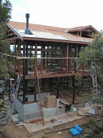 2000年2月1日〜 二階床の根太、屋根桟(横)、筋交、一階床の根太を取り付け、北東側の軒天を張り、サッシを数箇所取り付けました。 大工さんが2月末から一箇月ほど諸用で留守になり、仕事が一時中断します。