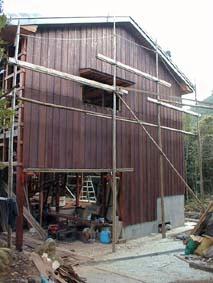外壁も屋久島産のスギ(地杉)の板を使っています。前以て柿渋とベンガラ(ダークボルドー)を混ぜて塗りました。なかなか渋い色に仕上がっています。