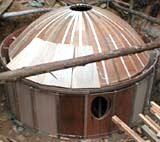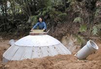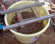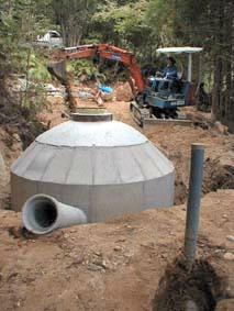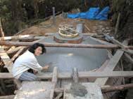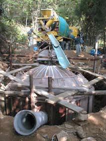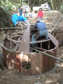 1999年11月1日〜8日 先月に引き続き大工さんに醗酵槽の型枠を造ってもらいました。鉄筋や鉄製のセパレーターを使うとバイオガスの原料によって侵され、ガス漏れや液漏れの原因となるため、それらを一切使わないという難しい条件での型枠づくりでした。特に上部は内外にかかる圧力を均一にするため、ドーム状の構造にしたのでかなり大変だったようです。また地面に掘った大きな穴の中での建築なので、雨が降るたびに大量の泥水が溜り、汲み出すのに一苦労でした。もちろん私達も出来る限り手伝いました。最後に投入口と排出口のヒューム管を差し込んで完了です。
