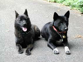 武蔵は、他の犬や日本人成人男性に対して少し警戒します。子供、女性、外国人には殆ど警戒しませんが、それは接し方や雰囲気によるものだと思います。攻撃的な犬は救助犬に向きませんが、武蔵は攻撃的ではないので馴らしていけば大丈夫でしょう。私と雁に対しては殆ど警戒しませんでした。これからは出来るだけ外に連れ出して、他人の手から餌(おやつ)をあげてもらうなど、少しずつ他人やいろいろな環境に馴らしていくように指導しました。また僅かながら独占欲があるので、なるべく手から餌をあげることと、おもちゃなどを与えっぱなしにしないように指導しました。 左の写真で左側が武蔵、右側が雁です。 |