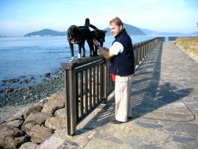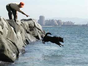 30日は雁の訓練のやり方を見本に示しながら一緒にお散歩をしました。右は「行け!」の号令で海に飛び込む雁です。 「heel(ついて)」を解除する時など、「free(離れて)」のコマンドを使うように指導しました。 要求吠えが出来たので「speak(吠えろ)」のコマンドを教えたらすぐに理解しました。うずくまっている人に対して吠えることも教えました。モチベーターはおやつか餌を使用しました。雁の捜索訓練に協力してもらいながら、捜索訓練のやり方も説明しました。 |