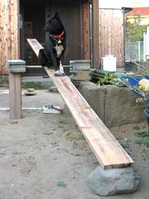 幅20cmほどの所の「cross(渡って)」はすぐ出来ました。丁度良いサイズの板があったのでシーソーも作りました。左の写真はシーソーの真中で「おすわり」をしている雁です。シーソーはまだ少し怖がるので低い位置から少しずつ馴らして高くしていくように指導しました。 高さ30cm、幅50cm位に竹の棒を並べて「jump(飛んで)」をさせたら出来たので、少しずつ幅を増やしていくように指導しました。 30cm四方位の蓋付き側溝は怖がって潜らなかったのですが、60cm四方位の蓋付き側溝は潜ることが出来たので、広い所で馴らしてからだんだん狭い所でも出来るように指導しました。 梯子はサイズ(踏板と踏板の間32cm、踏板の幅約30cm、踏板の奥行7cm、角度60°、6段)とやり方だけ説明しました。 |