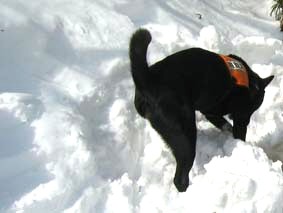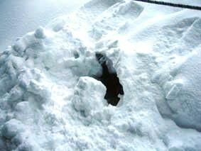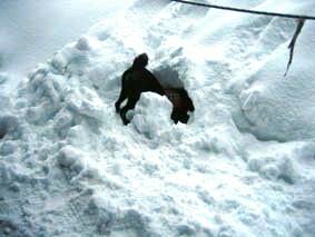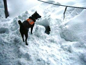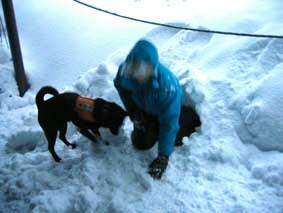 ←14日:いよいよ訓練開始。2メートルほど積った雪に穴を掘って人間が中に入り、入口を雪で密閉する。犬は埋っている人を捜し出すと、その場で雪を掘ったり吠えたりして雪の中に人間がいることを告知する。