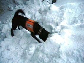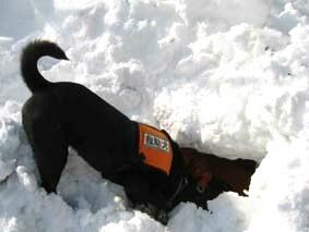 →犬が捜し出したら、雪の中にいる人は犬を良く褒めながらご褒美を与える。