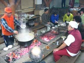 ←夕食は炭火を囲んで団欒。訓練会の目的は、技術を磨くだけでなく、仲間同士の親睦を深めるということもある。