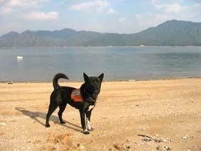 →海の向こうに宮島が見える広島県佐伯郡大野町の海岸で。近くで釣りをしていた人に頼んでその場にうずくまってもらい、捜索訓練をした。