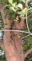 シャシャンボ <南燭・小小ん坊> Vaccinium bracteatum [ツツジ科] 分布:本州(関東南部・石川県以西)、四国、九州、沖縄、朝鮮南部、中国、台湾 開花期:6〜7月 用途:庭木 常緑低木〜小高木。暖地の山地に自生し、高さ2〜3m、稀に10m程になる。葉は厚い革質で卵形、または楕円状卵形で長さ2.5〜6cm、上部に浅い鋸歯がある。葉の脇から長さ2〜5cmの総状花序を出し、白色の花を多数下向きに開く。花冠は長さ7mm程の壷状長鐘形で先は浅く5裂する。液果は直径5mm程の球形で黒紫色に熟し、甘酸っぱくて食べられる。 |