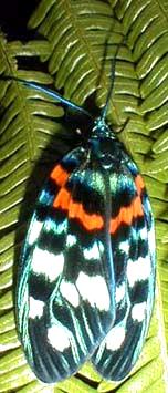 シロシタサツマニシキ Erasmia pulchella fritzei JORDAN [鱗翅目異脈亜目マダラガ科] 分布:屋久島、種子島、沖縄 開張92mm程の蛾で青緑色の金属的光沢がある。成虫は8月と10月に出現し、昼間風に乗ってひらひらと飛ぶ。捕えると死に真似をし、胸部から悪臭のある黄色の液をぶくぶくと泡状に出す。幼虫はヤマモガシの葉を食べる。本州(和歌山)、四国、九州、中国北部のものは後ばねの白色部が少なく、サツマニシキ subsp. sangaica MOORE という。 |