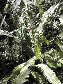 タマシダ <玉羊歯> Nephrolepis cordifolia (L.) PRESL [ツルシダ科タマシダ属] 分布:本州(伊豆半島以西)、伊豆諸島、小笠原、四国南部、九州、沖縄、世界の亜熱帯〜熱帯 海岸沿いの向陽の地に生える常緑シダ。岩や樹幹に着生することもある。根茎は短く、斜上から直立、鱗片が密に付き、針金状の根と走出枝を生じる。葉身は単羽状、線状披針形、鋭頭、下方に向けて徐々に狭くなり、大きいものは長さ80cm、幅6cmに達する。側羽片は多いもので100対にも達し、開出して付き無柄、中部のものが大きく、長さ3cm、幅7mm程。根に長軸2.5cm、短軸2cm程になる楕円体の貯水の玉をつくり、乾燥に耐える。生花に用いられよく栽培される。 |
