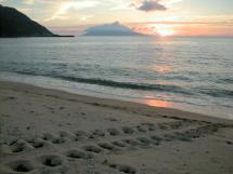 永田では口永良部島に沈む夕日がとても美しく見られます。この時期、ウミガメが産卵のため次々に上陸し、白い砂浜に無限軌道のような足跡をいくつも残していきます。今年も無事にたくさんの子ガメが孵りますように……。 |