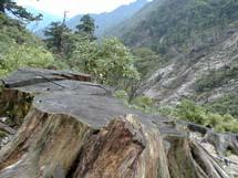 ここは昭和50年代まで盛んに伐採が行われていたところです。樹齢1000年を越える屋久杉の切株が点在し、ようやく低木が生え始めた斜面は、原生林もろとも切られた当時の様子を生々しく物語っています。現在でもこの付近では伐採が行われ、その中には1000年を越える屋久杉の生木も混ざっています。屋久島では今でも年間数百立方メートルもの材が島外に持ち出されていると言われていますが、これは一体いつまで続くのでしょうか? |
