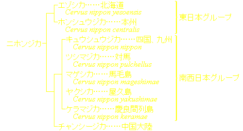 この他にヤクシカの近縁と思われるシカが口永良部島に、マゲシカの近縁と思われるシカが種子島にいる。 |