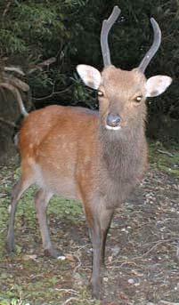 ヤクシカ Cervus nippon yakushimae ぐうてい [偶蹄目シカ科] 分布:屋久島(固有亜種) ニホンジカの亜種。本土のニホンジカより一回り小さい。成体の雄の角も小さく、本土のニホンジカが3回枝分れするのに対し、2回しか分れないことが多い。左の写真の雄は2歳くらいと思われる。成体になるには4年くらいかかる。 ニホンジカは次の様に分類され、また分布している。