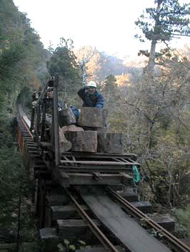 トロッコで土埋木を運び出す光景 このトロッコはレールを溶接して造られています。トロッコは機関車で引っ張って上り、土埋木を積んだ後機関車から切り離し、手動ブレーキを掛けながら下りてきます。ブレーキ片は木で出来ていて、ロープを引っ張るとそれが車輪に当ってブレーキが掛かる仕組です。ブレーキの掛け方を誤ると脱線することもあり、操縦には経験と勘が必要です。またチェーンソーの扱いや集材機の運転など、土埋木を運び出すには色々と危険な作業が伴います。 |