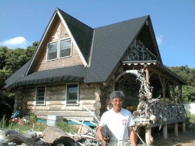 山本さんは横浜から移住してきて、平内海中温泉のすぐ近くにログハウスを建てて住んでいます。テラスは流木で飾られていてとても素適です。今は主にガイドの仕事をやっています。
